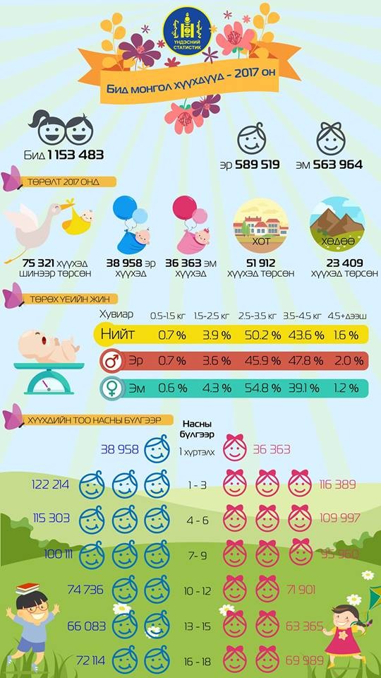 Олон улсын хүүхдийн эрхийг хамгаалах өдөр маргааш тохионо. Иймд Үндэсний статистикийн газраас Монгол хүүхдүүдийн талаарх тоон мэдээг гаргажээ.