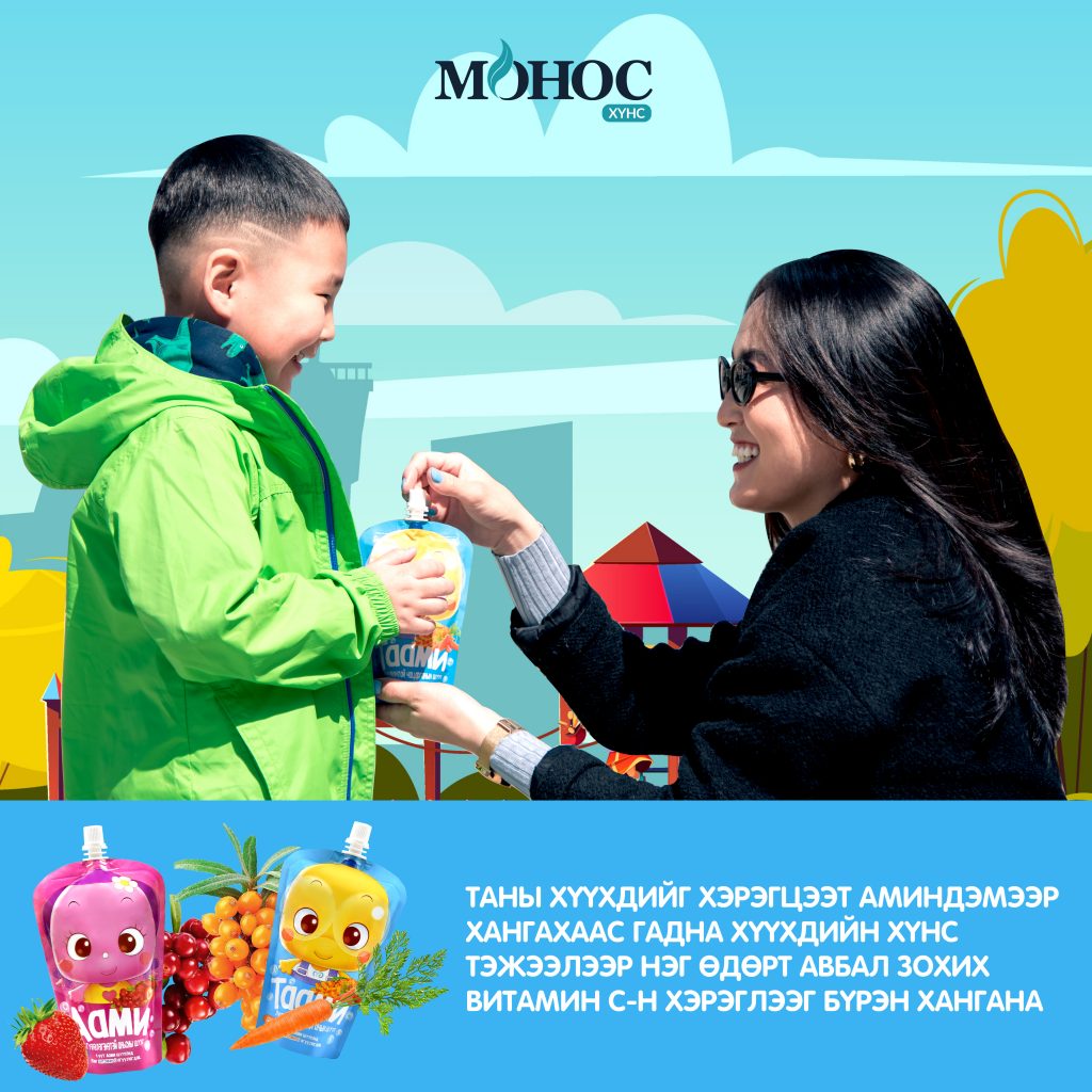 Үндэсний контентийг дэмжих зорилгоор Монос Хүнс компани нь Монгол Контент компанийн "Маамуу" брэндтэй хамтран ажиллаад багагүй хугацааг өнгөрүүлжээ. Энэ хугацаанд бид хүүхэд багачуудын дуртай Аами, Таами нэрийн ундаа болон үзэмтэй үрлийг бяцхан хэрэглэгчиддээ зориулан үйлдвэрлэж байна.
