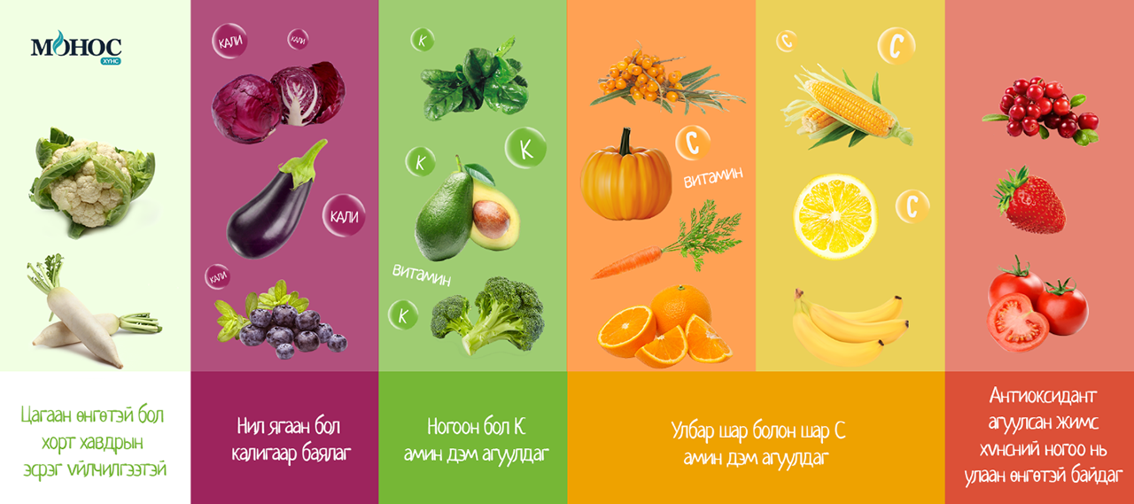 Хүнсний ногоо, жимс жимсгэнэ бүхэн өнгө үнэр, амт зэргээрээ өөр өөрийн ашиг тустай болохыг та доорх зургаас олж мэдээрэй: