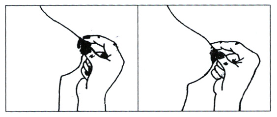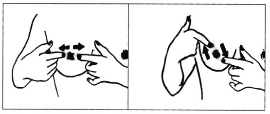 - Саахдаа гарын 4 хурууг хөхний доод талд, эрхий хурууг дээд талд хөхний толгойноос 1-2 см зайд тавиад хойш нь дарж, шахах байдлаар саана. Хөхний арьсыг шувтарч сааж болохгүй.